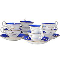 Four Ridgway bone china trios, each decorated with a wide blue band with white and gilt flowers and leaves, above scalloped gilt edging, circa 1840 Tea cup 5.5 13 10.5 cms Saucer 15 cm Priced individually