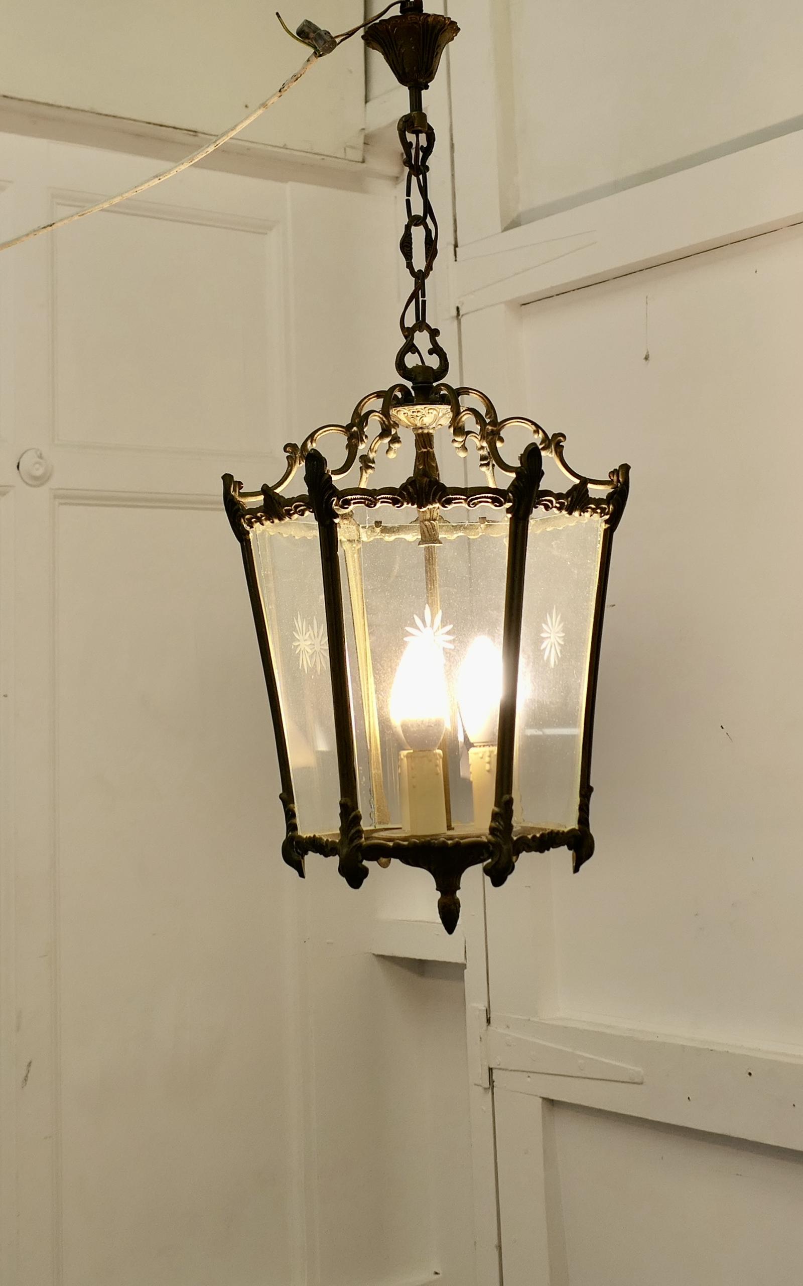Rococo Style Brass and Etched Glass Lantern Hall Light