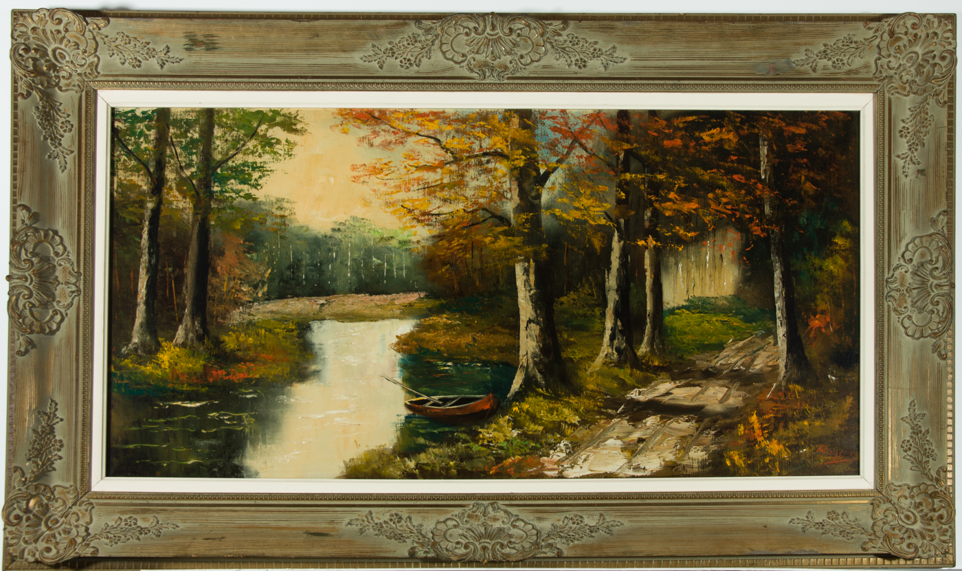 Rogiers - Large Framed Contemporary Oil, Forest River in Autumn