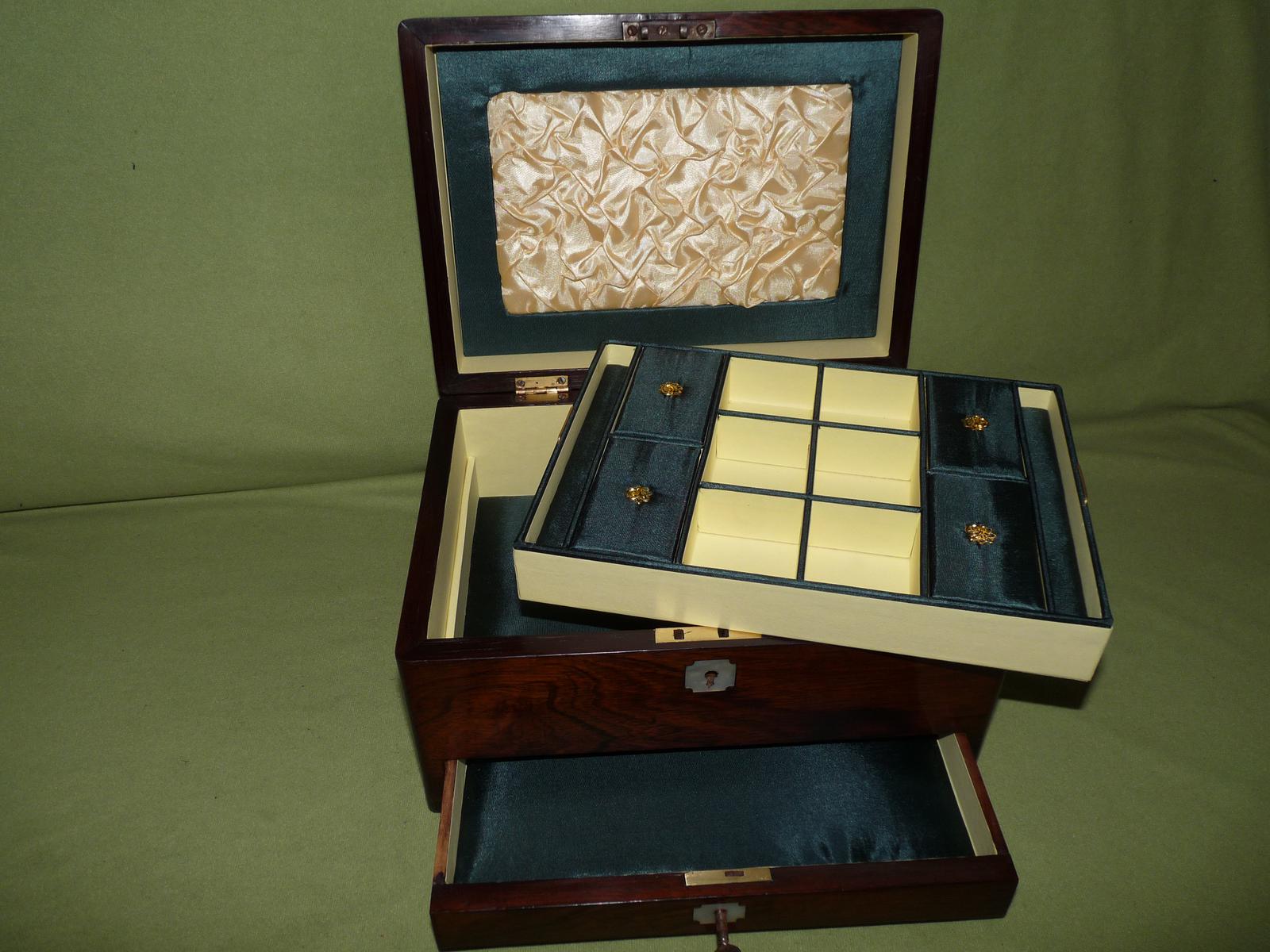 Rosewood Jewellery Box. Drawer + Tray. Plush Interior