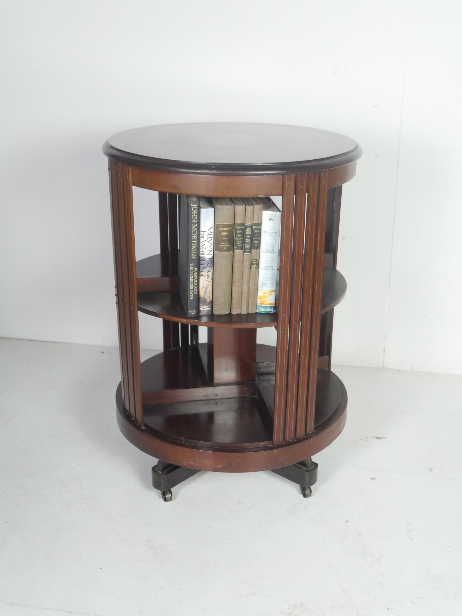 This is a round revolving display bookcase, created around 1900. The bookcase features a circular design with multiple shelves for displaying books or decorative items. It is constructed from mahogany, exhibiting craftsmanship typical of the early 20th century. The revolving mechanism allows for easy access to items stored on the shelves.