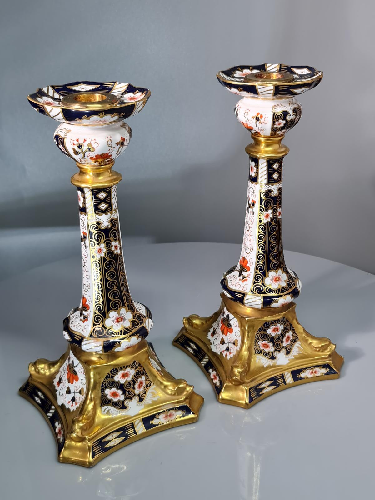 Royal Crown Derby Pair of Old Imari Solid Gold Band Large Candlesticks