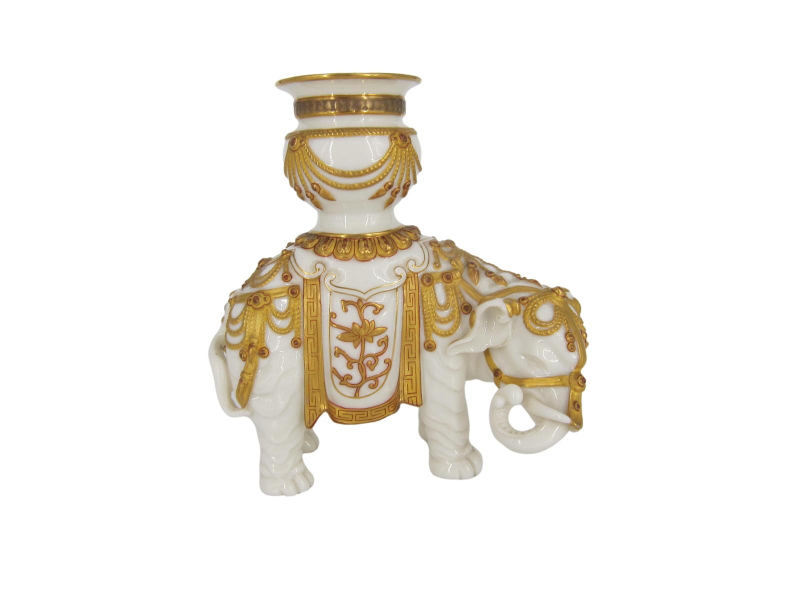 Royal Worcester Porcelain Elephant with Gilt Harness & Candlestick Howdah