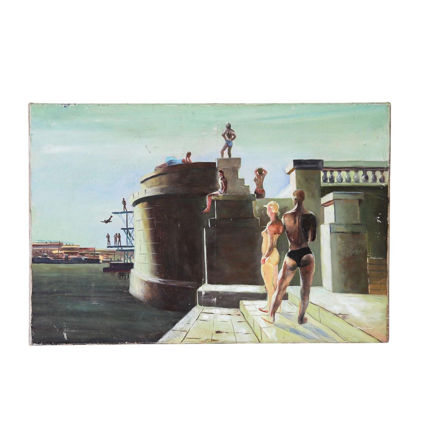 Russian oil on canvas painting of swimmers, executed in the dynamic, modernist style of Aleksandr Deyneka (1899–1969). With strong graphic composition, rhythmic movement and a sun‑lit palette, this mid‑century work evokes the clarity, optimism and spaciousness of a world that no longer exists - a striking decorative piece with powerful interior design appeal.