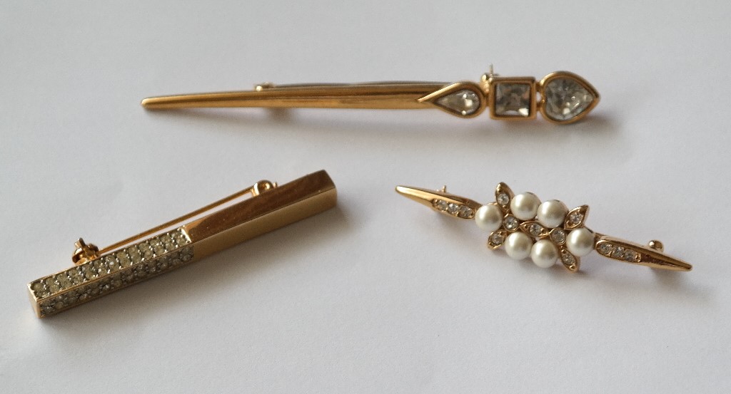 SALE - Three Gilt Rhinestone & Pearl Bar Brooches / Pins / Ideal Gift / Present / Jewellery (1 of 1)