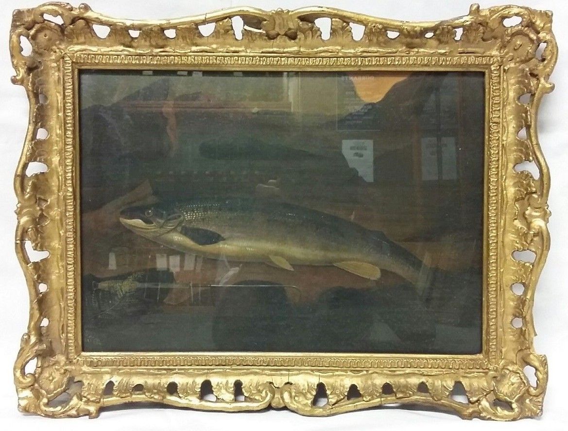 'Salmon on a Rock' Victorian Oil on Board Painting c.1850
