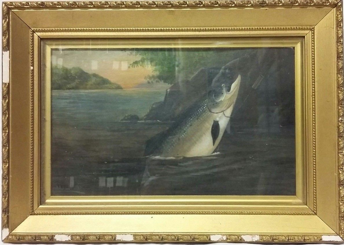 'Salmon on Line' Victorian Oil on Board Painting Signed A.Roland Knight