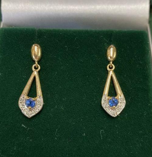 Sapphire & Diamond on 9ct Gold Drop Pierced Earrings