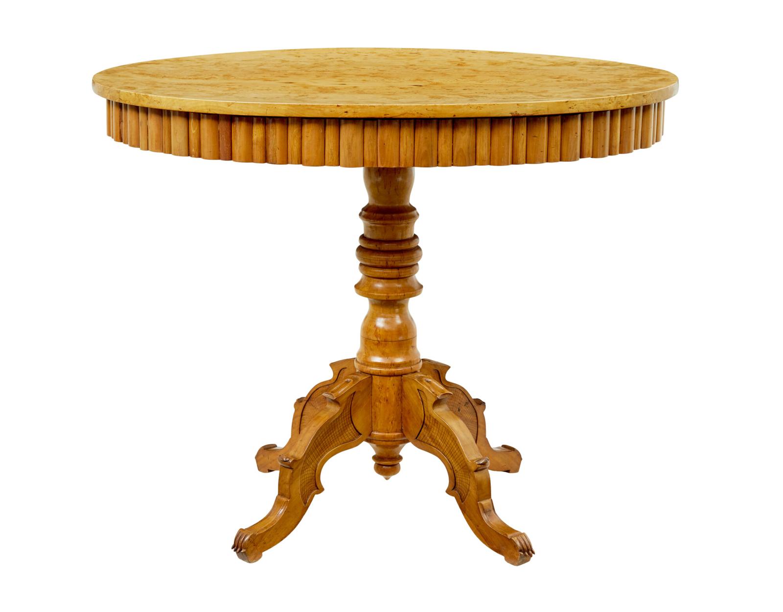 Swedish 19th century oval occasional table made in solid birch circa 1880. We are pleased to offer this occasional table which has unusually been made in solid birch. 4 plank solid burr birch top, formed into an oval shape. Apron formed of shaped birch segments, which run around the whole border. All raised on a turned stem and 4 scrolling legs complete with scribed detailing. Terminating on a carved paw foot with claws. Minor surface fading, minor surface marks, minor losses to some of the claws on the feet. Rich golden colour and ready for everyday use. Height: 75 cm width: 94. 6 cm depth: 64. 1 cm