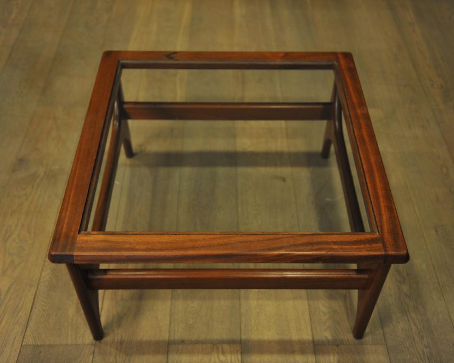 Scandinavian dark teak coffee table with a glass top