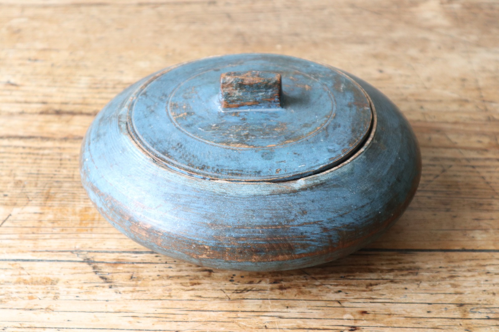 Scandinavian / Swedish 'Folk Art' Original Blue Paint, Sliding Lock Lid Wooden Bowl 19th Century (1 of 1)