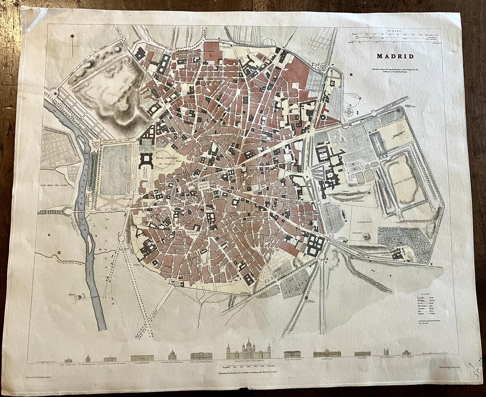 Scarce Original 1831 City Plan of Madrid Spain Large Size With Hand Colouring