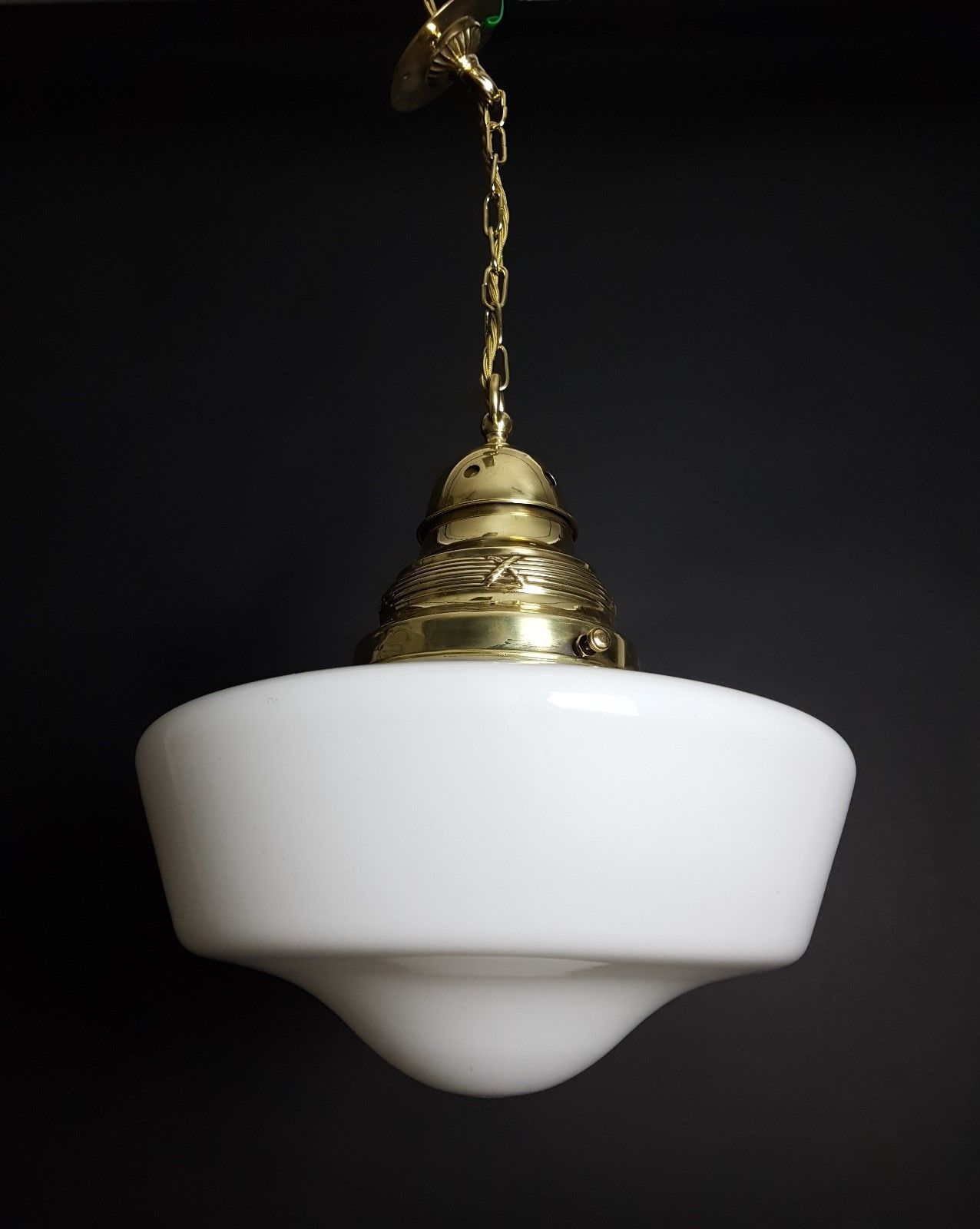 School / Chapel White Ceiling Light with Brass Gallery; Rewired C.1930