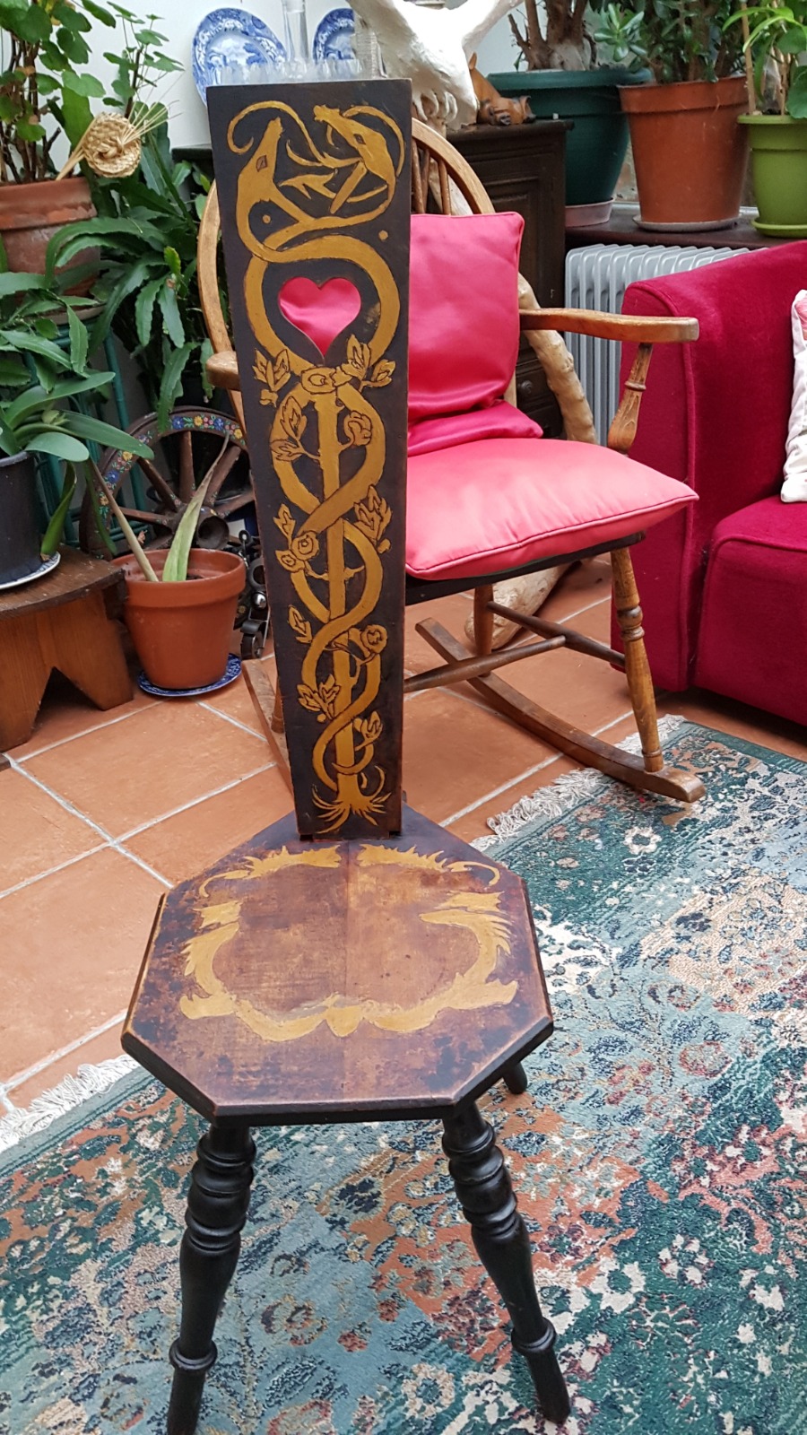 Scottish Celtic or Pictish Design, Pokerwork and Gold Painted Spinning Chair or Stool: Pine
