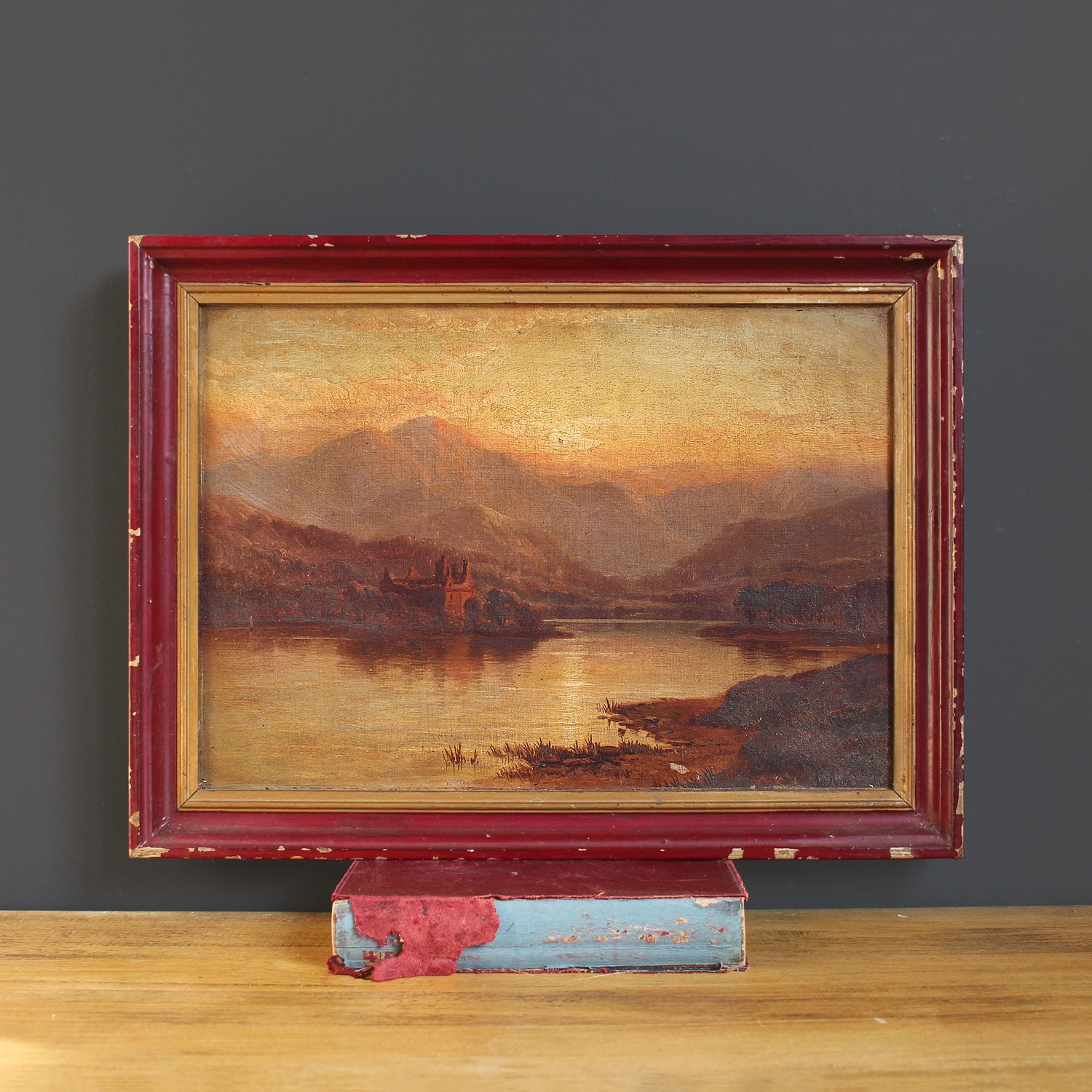 Scottish Loch with Island Castle, Antique British Oil Painting, Sunset