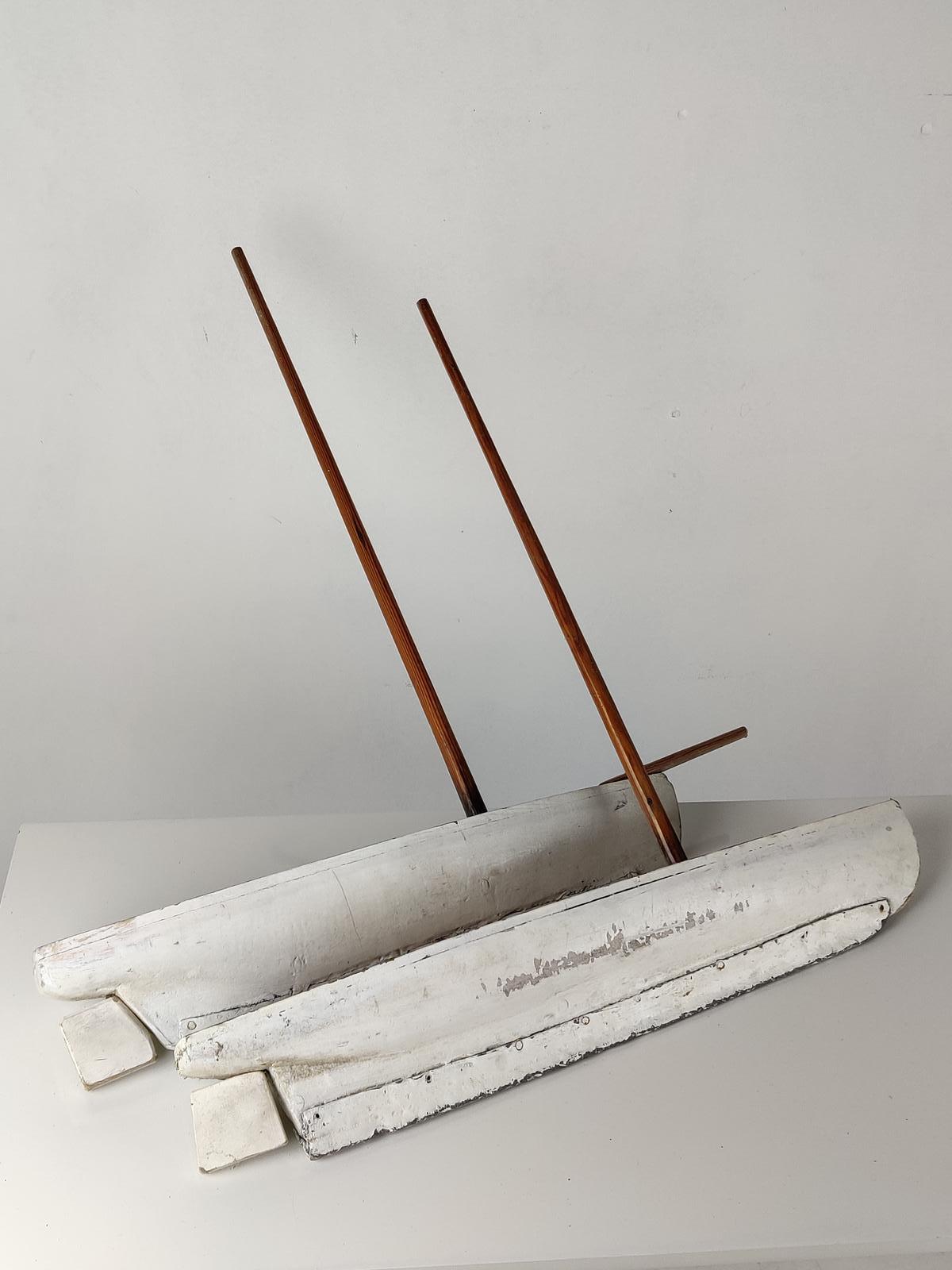 A pair of Scratch Built Pond Yacht Hulls and very unique. Ideal for that decorator's piece. Perfect also for a collector or hobbyist. Naively crafted and in original untouched condition. Dating from the early 20th century. Fabulous for a themed interior. Each mast is removable.