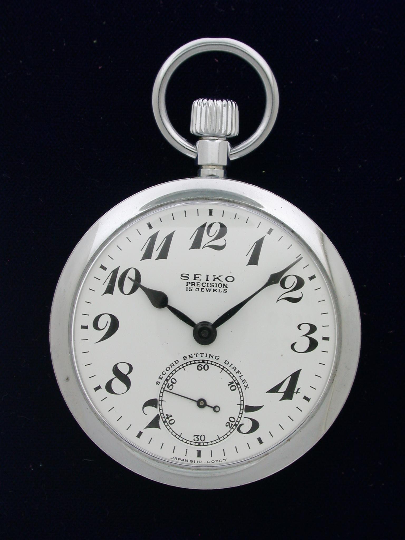 This Seiko Precision 15-jewel pocket watch is fitted with a second-setting (hacking) mechanism, designed to allow precise time synchronization. When the crown is pulled out to set the time, a small internal lever moves into contact with the balance or the gear train of the movement. This action immediately stops the oscillation of the balance wheel, which in turn halts the seconds hand.
