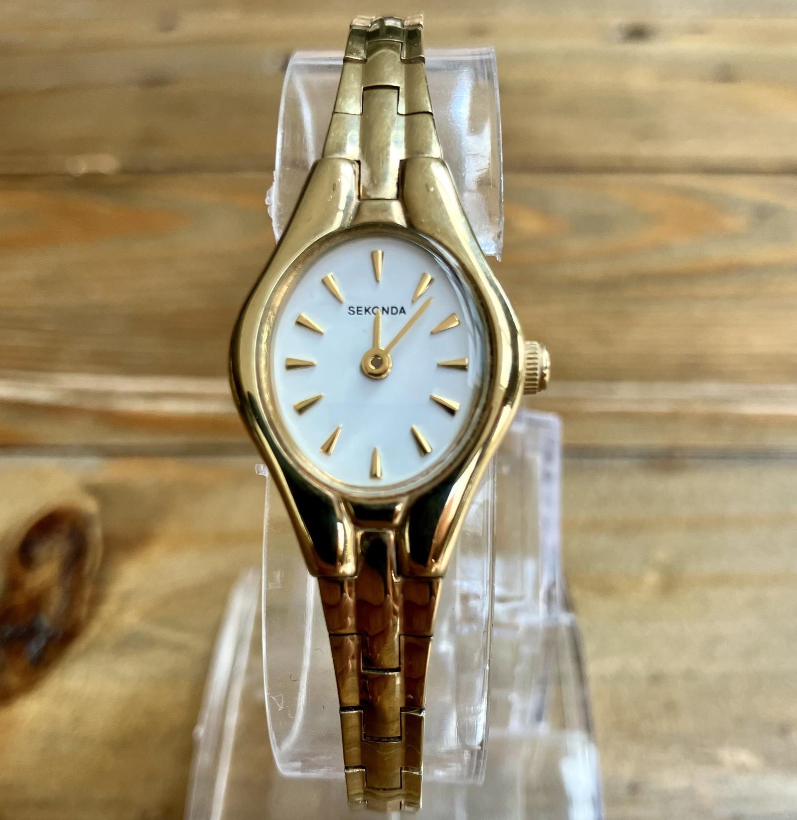 A vintage Sekoda ladies’ quartz wristwatch featuring an oval gold-plated case with integrated bracelet.