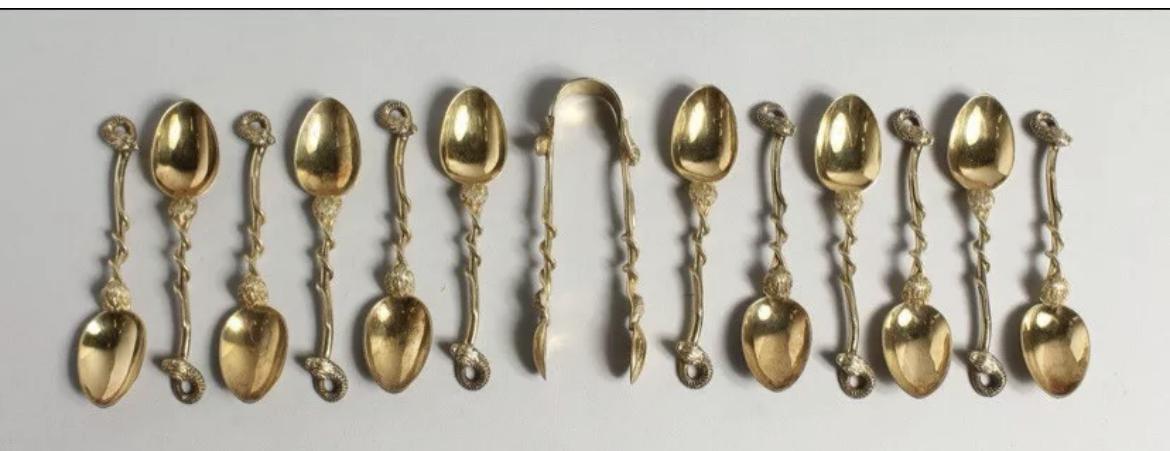 Serpenst Set of Twelve Silver Gilt Coffee Spoons & Pair of Sugar Tongs
