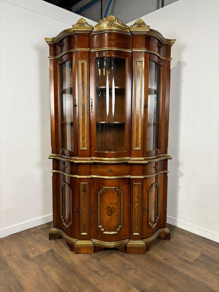 A striking and elegant serpentine-front cabinet featuring beautiful Italian marquetry inlay and decorative gilt detailing. This piece offers both display and storage, with a classic continental style that adds warmth and character to any interior.