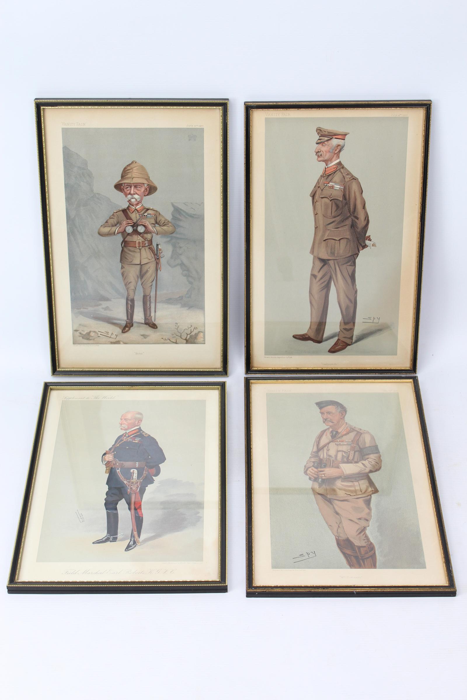 A wonderful set of 4 antique framed Vanity Fair Spy military prints, printed by Vincent Brooks Day & Son. Mounted and glazed in gilt black frames, these antique prints are a good collection to bring a little satirical humour to your wall.