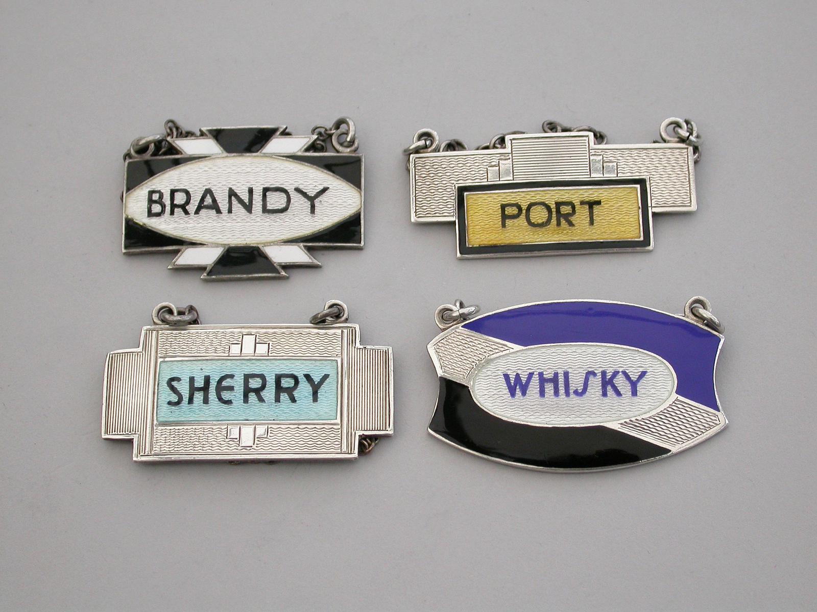 Set 4 Art Deco Silver & Enamel Wine Labels Sherry / Brandy / Port / Whisky