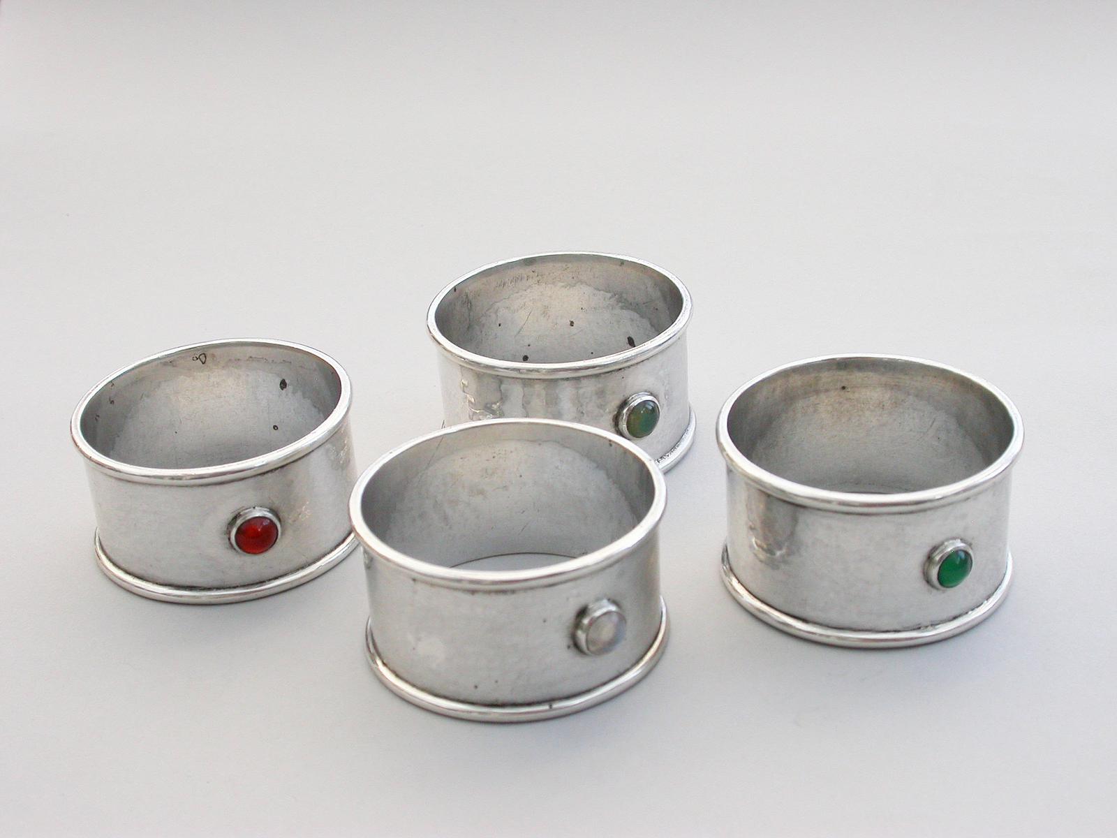 Set 4 Arts & Crafts Style Silver Napkin Rings With Hard Stones