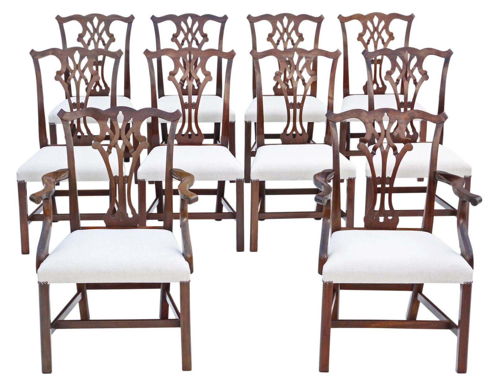 Set of 10 (8+2) Mahogany Georgian Revival Dining Chairs Ribbon Back c.1920-1950