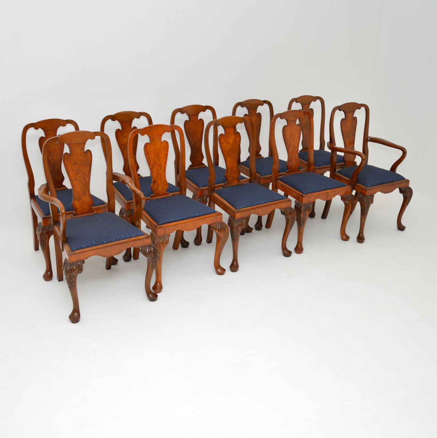 Set of 10 Antique Queen Anne Style Burr Walnut Dining Chairs (1 of 13)