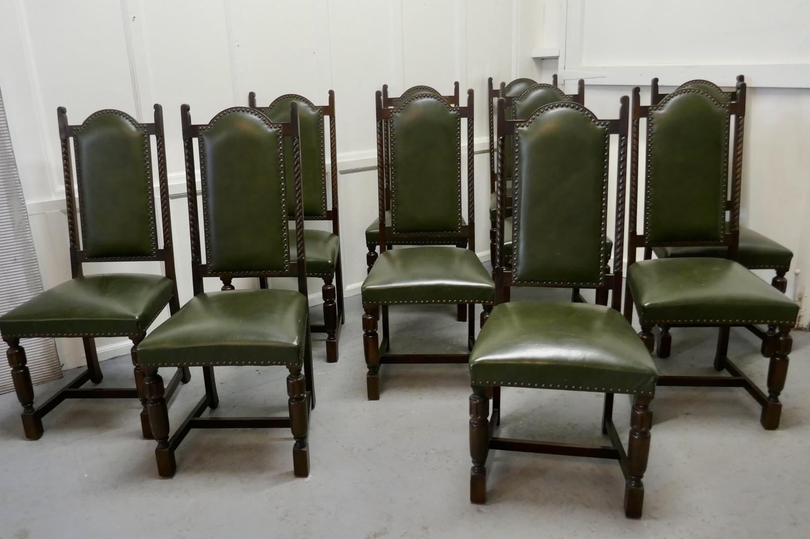 Set of 10 Arts & Crafts Oak and Leather Dining Chairs