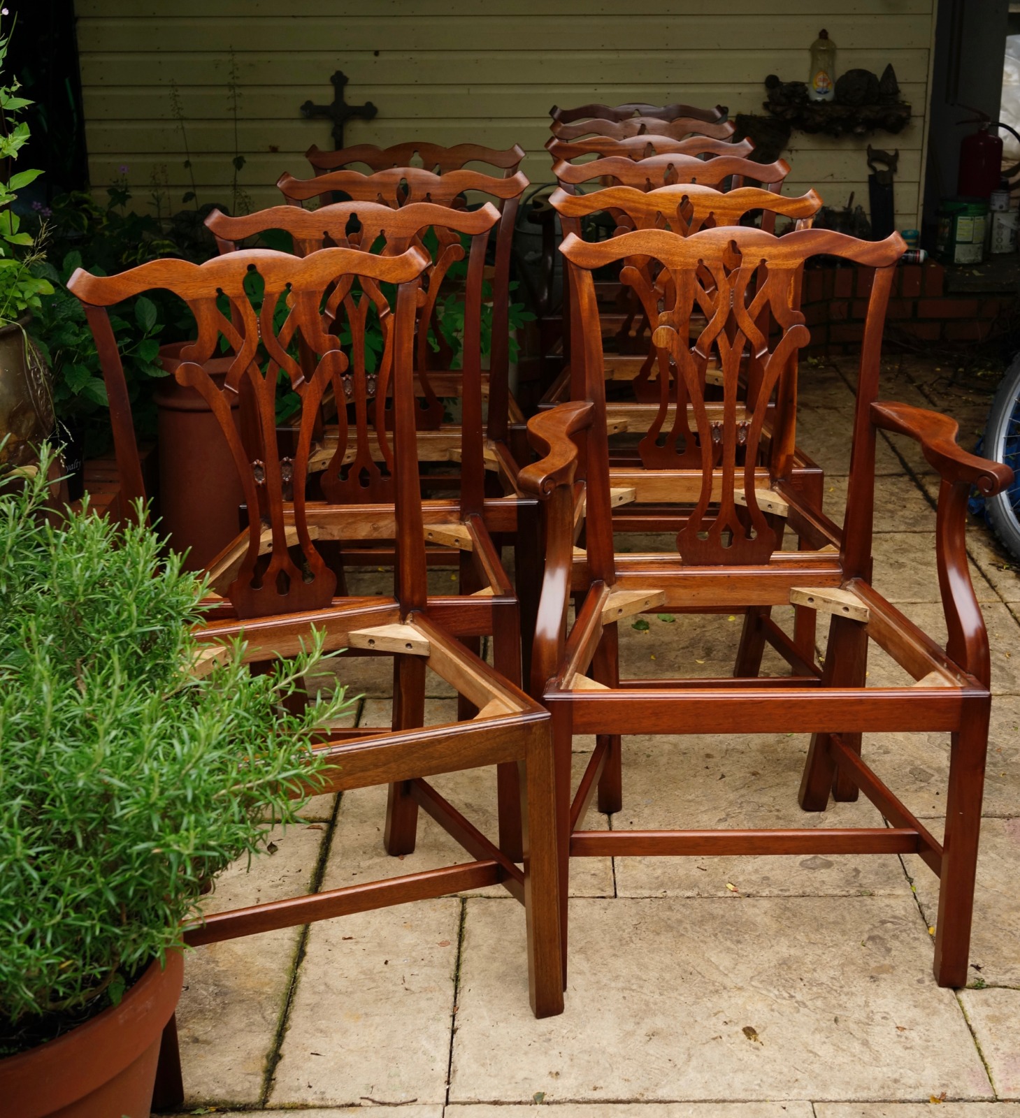 Set of 10 Solid Mahogany Country Chippendale Dining Chairs Comprising of 8 Singles + 2 Carvers