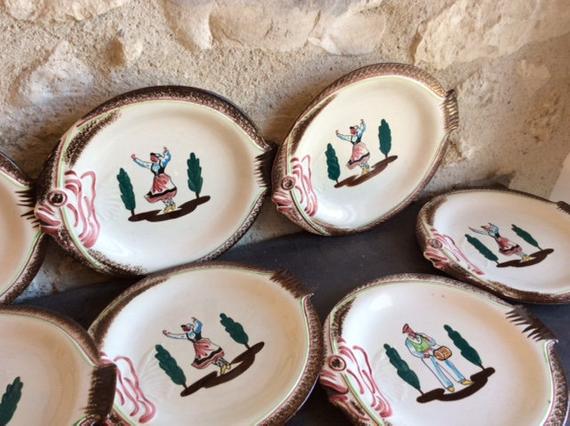 Set of 10 Vintage His and Hers Handpainted French Faience Pottery Fish Plates by Mefa 26cm