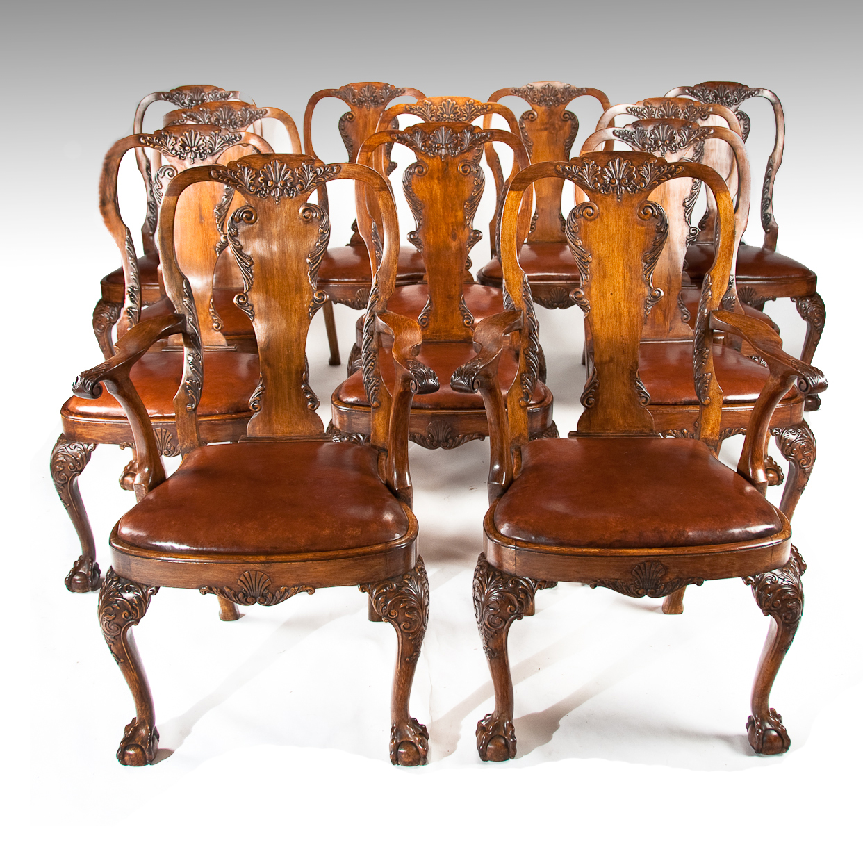 Set of 12 Walnut Leather Upholstered Dining Chairs