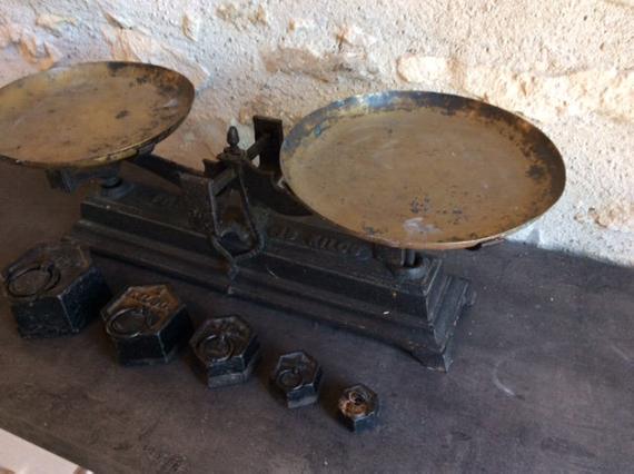 Set of 19th Century French Cast Iron & Brass Balance Scales to Weigh 15Kg by Force with 5 Weights