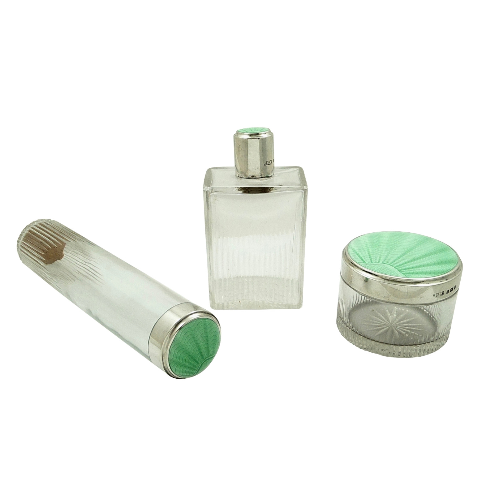 Set of 3 Antique Sterling Silver & Green Enamel Vanity Jars 1937
