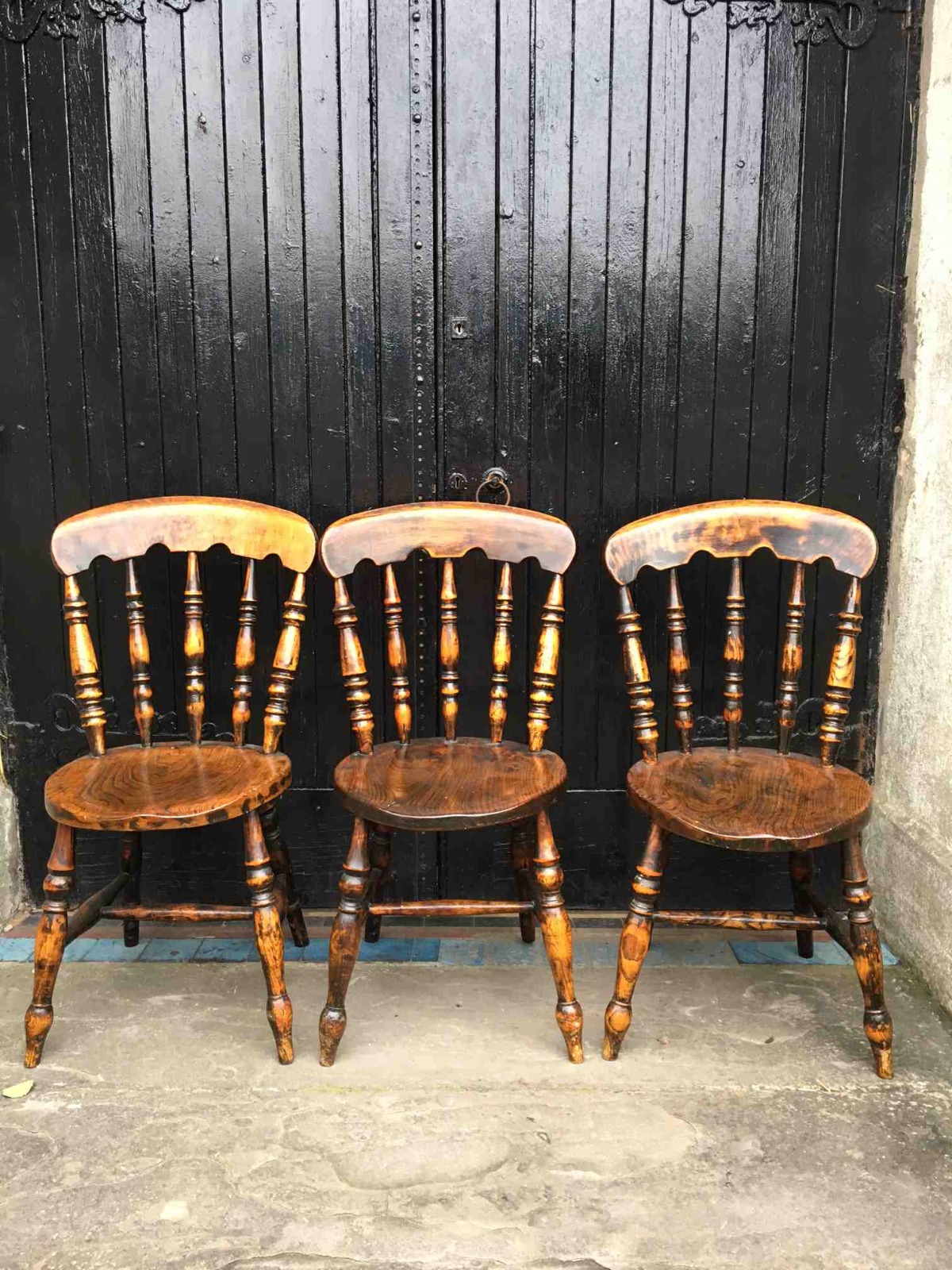 Set of 3 Beautiful 19th Century Ash & Elm Penny Seat Chairs with Turned Legs