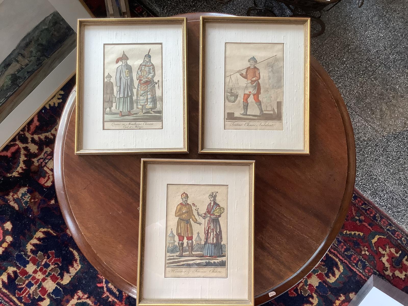 These are rather fun! 3 antique French lithographs depicting "Chinese men and women". "Chinese Mandarins, Civil and Military" and "Chinese itinerant trader". A label verso shows they were framed in Hong Kong, which probably explains the silk mount, which is very attractive.