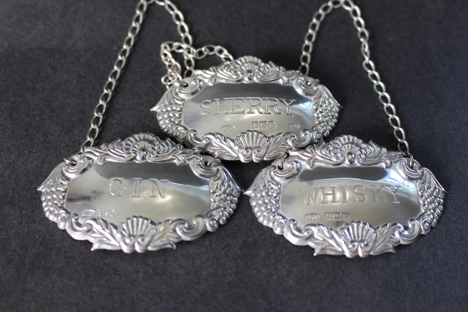 Set of 3 Silver Decanter Labels for Gin, Whisky and Sherry