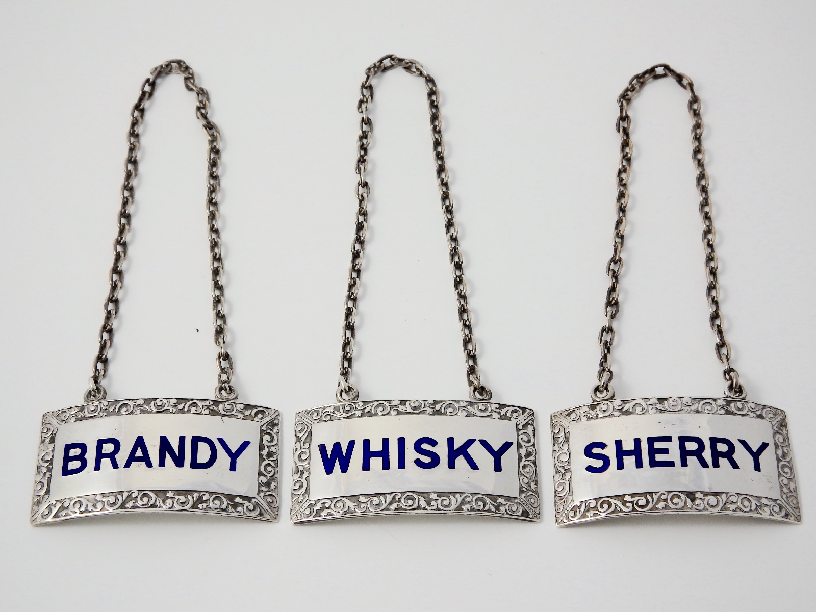 Set of 3 Silver & Enamel Decanter Labels - Birmingham 1971
