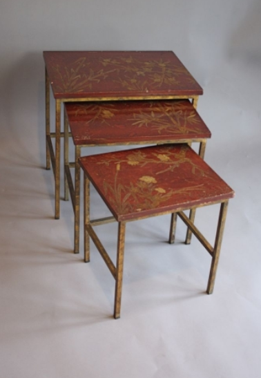 Set of 3 Tables in Deep Red Lacquer with Golden Bamboo Decoration circa 1960