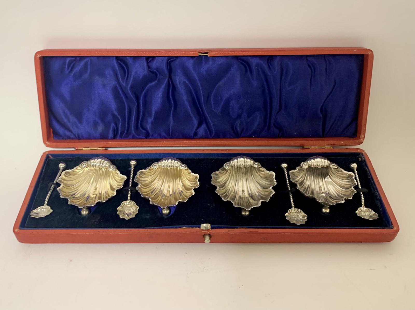 Set of 4 Antique Solid Silver Shell Salts and Spoons