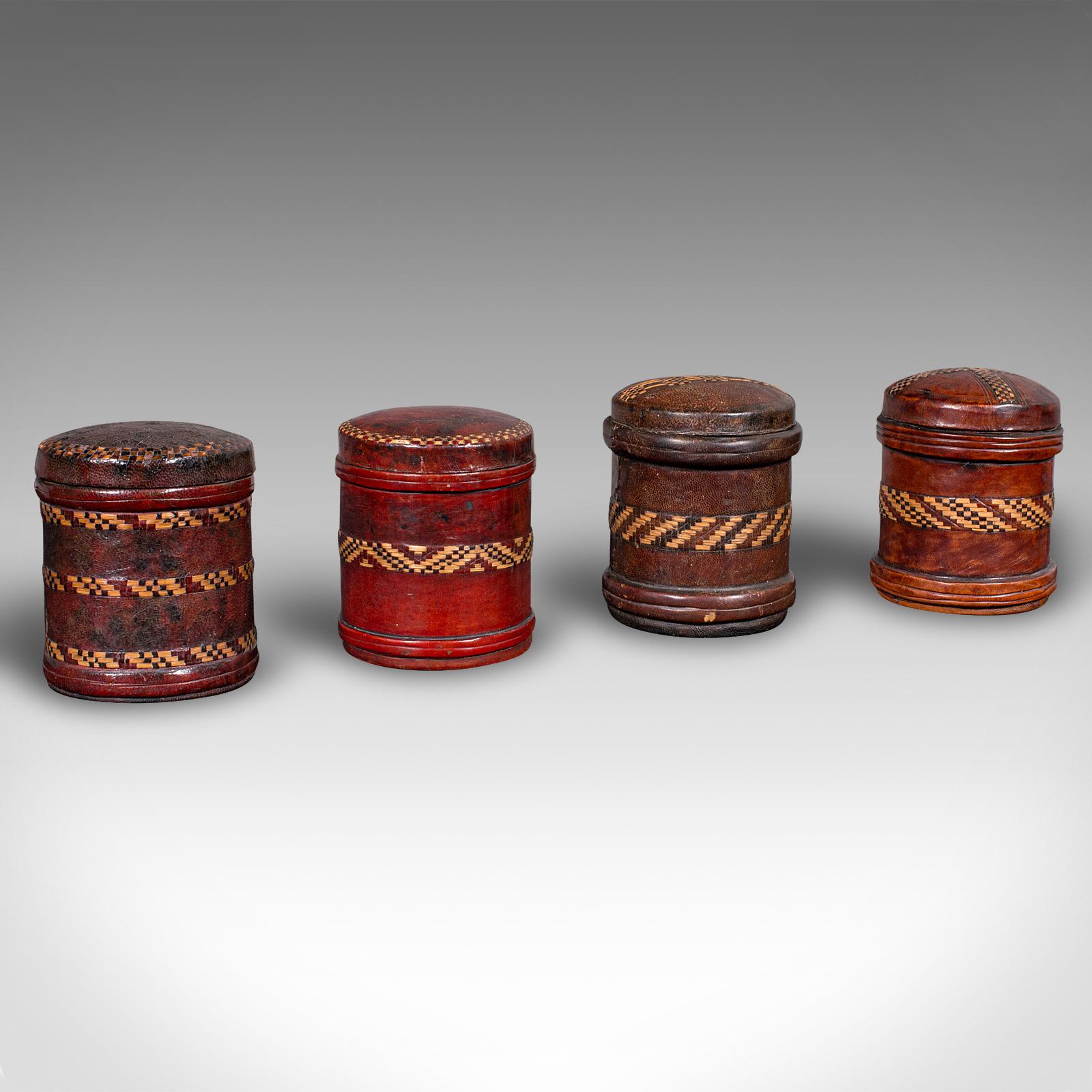 Set of 4 Antique Storage Tins, English, Morocco Leather, Cigarette Pot c.1920