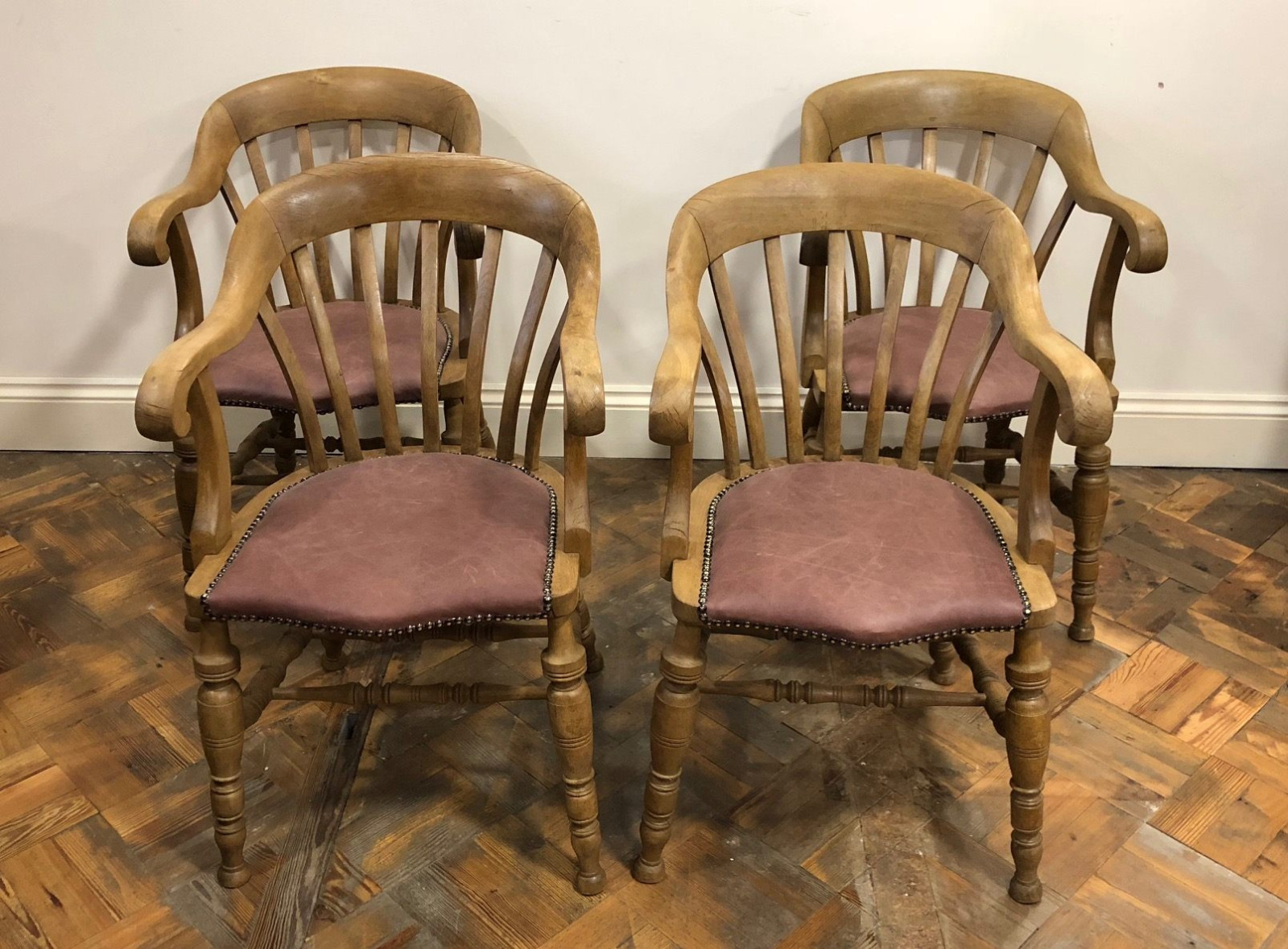 Set of 4 Antique Wooden Bow Armchairs with Leather Seats (1 of 1)