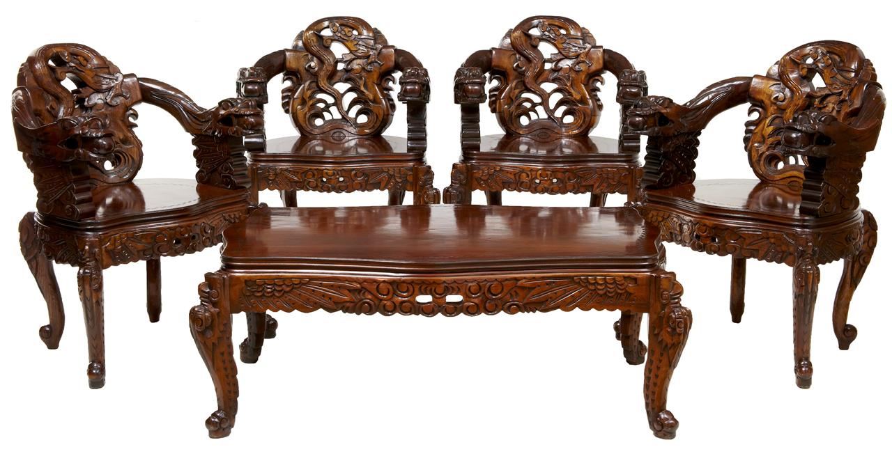 Set of 4 Carved Chinese Armchairs with Matching Coffee Table (1 of 1)