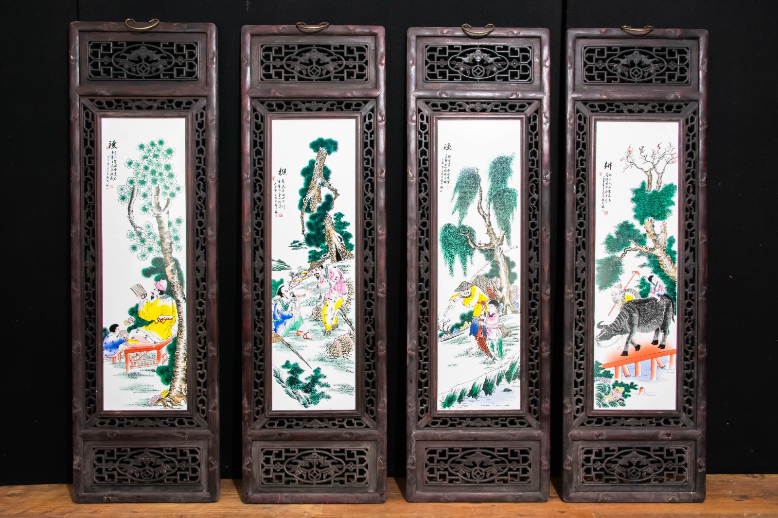 Set of 4 Chinese Porcelain Plaques - Famille Rose Hardwood Frame