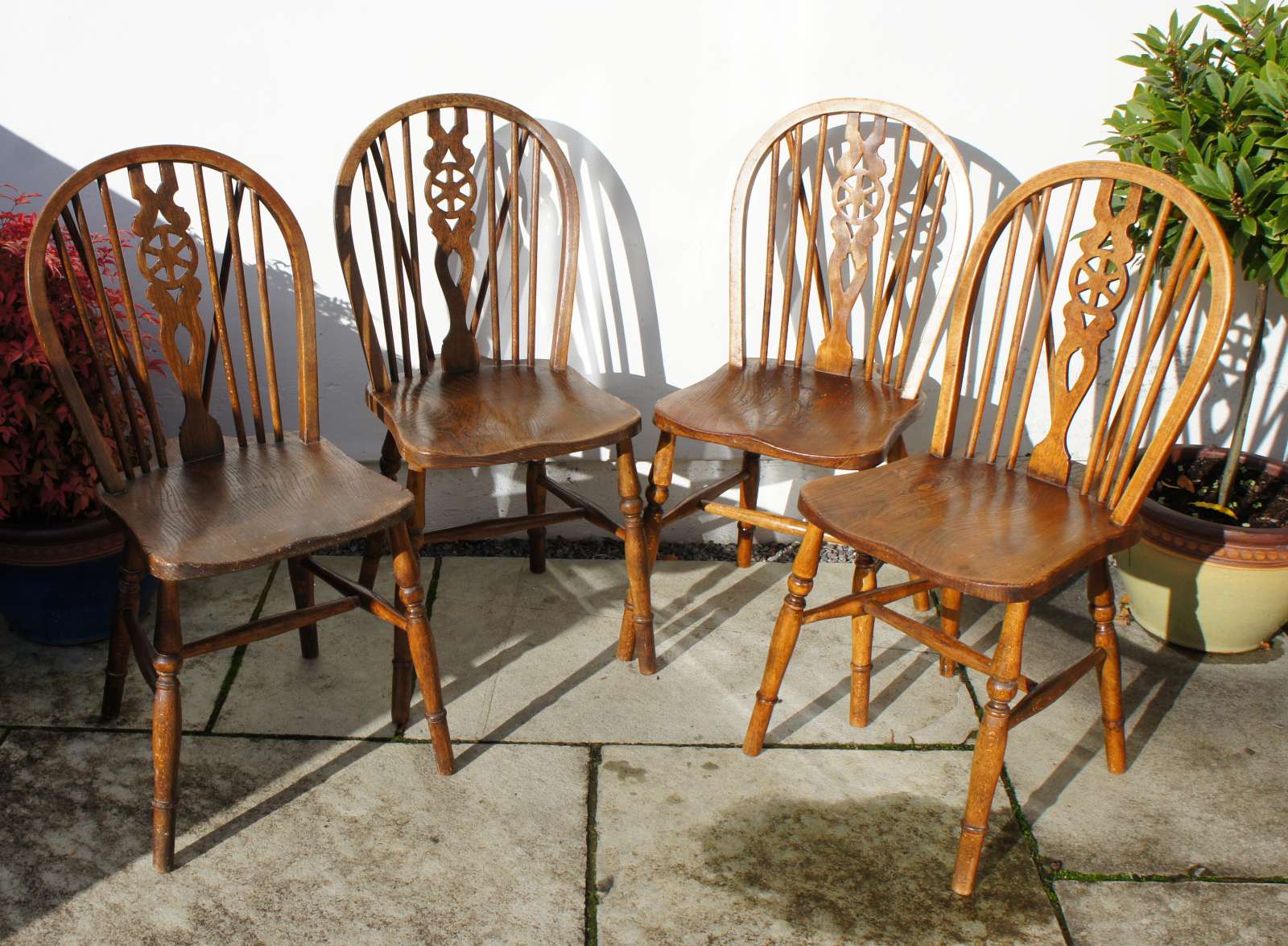 Set of 4 Early 20th Century Wheel Back Windsor Kitchen Chairs