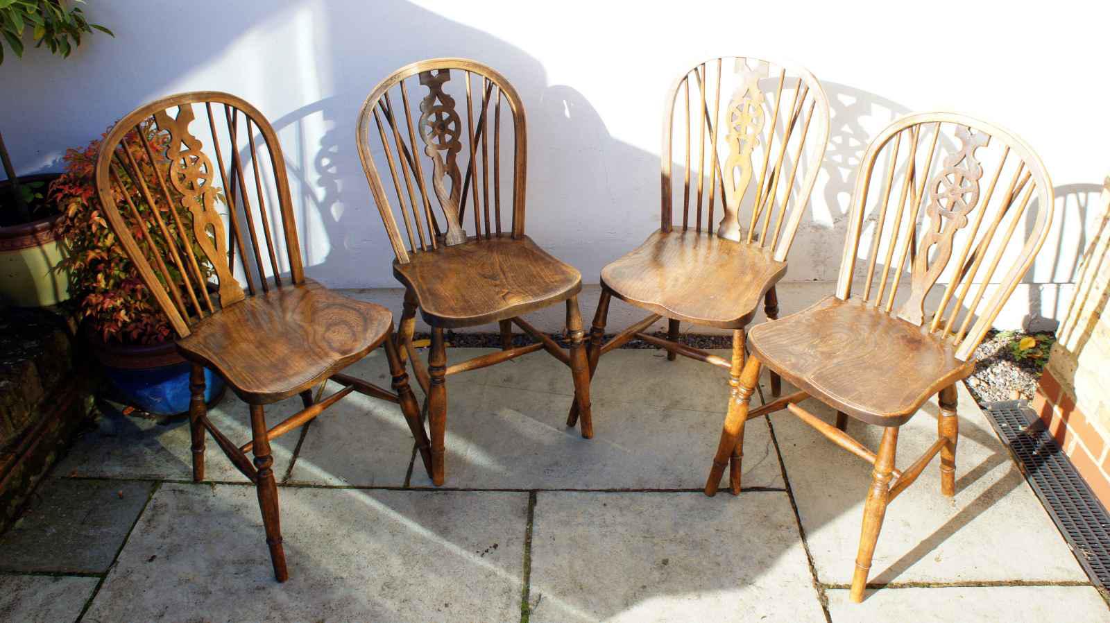 Set of 4 early 20th century wheel back Windsor kitchen chairs in Elm & Beech
