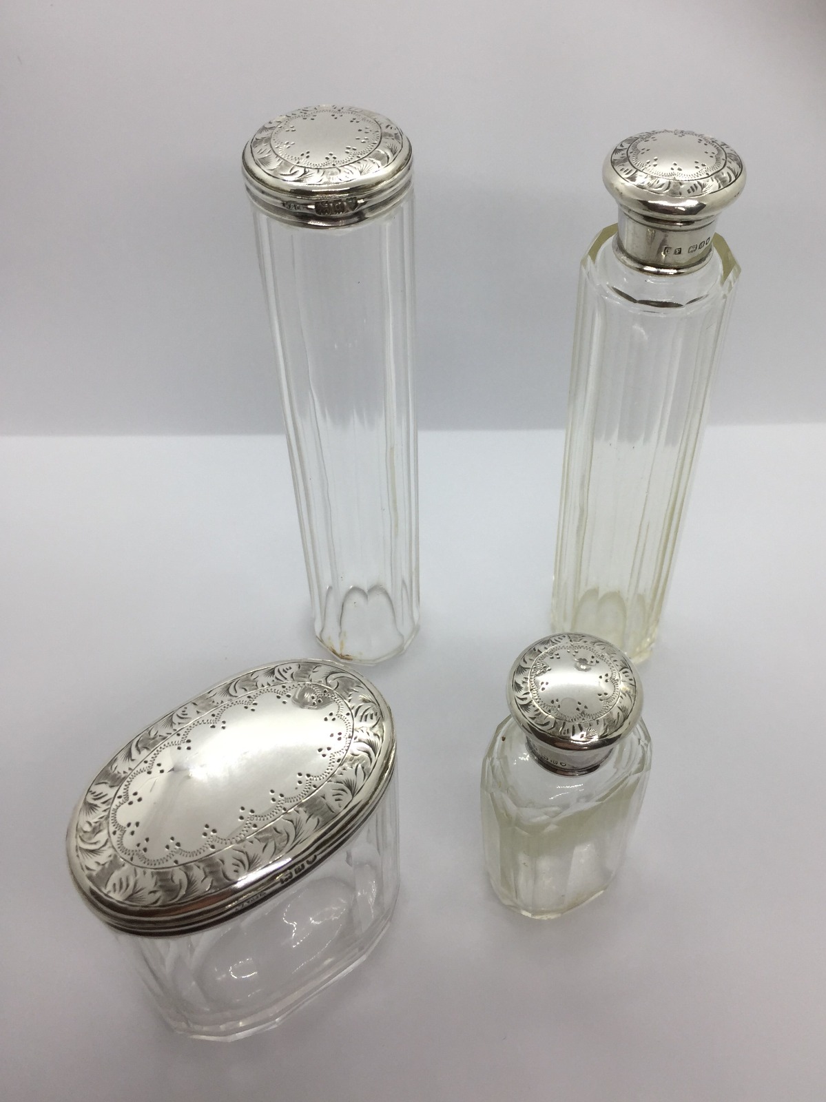 Set of 4 Elegant, Antique, Late Victorian, Silver Topped Perfume & Dressing Table Bottles, London 1899