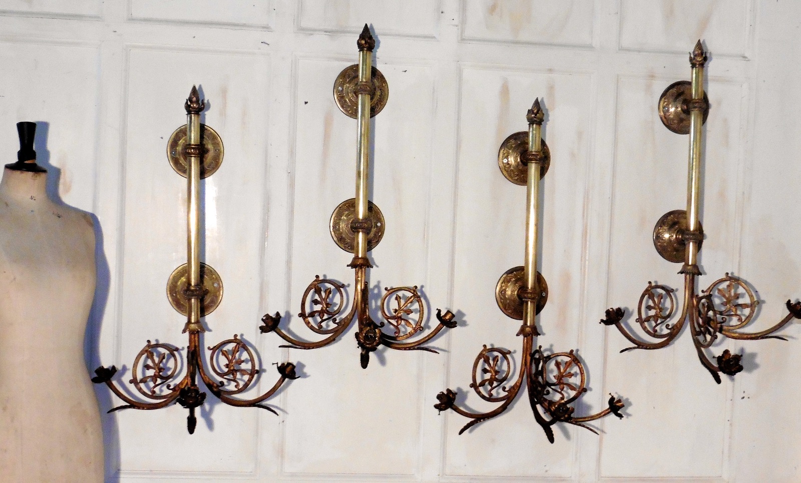 Set of 4 French Very Large Brass Triple Wall Lights