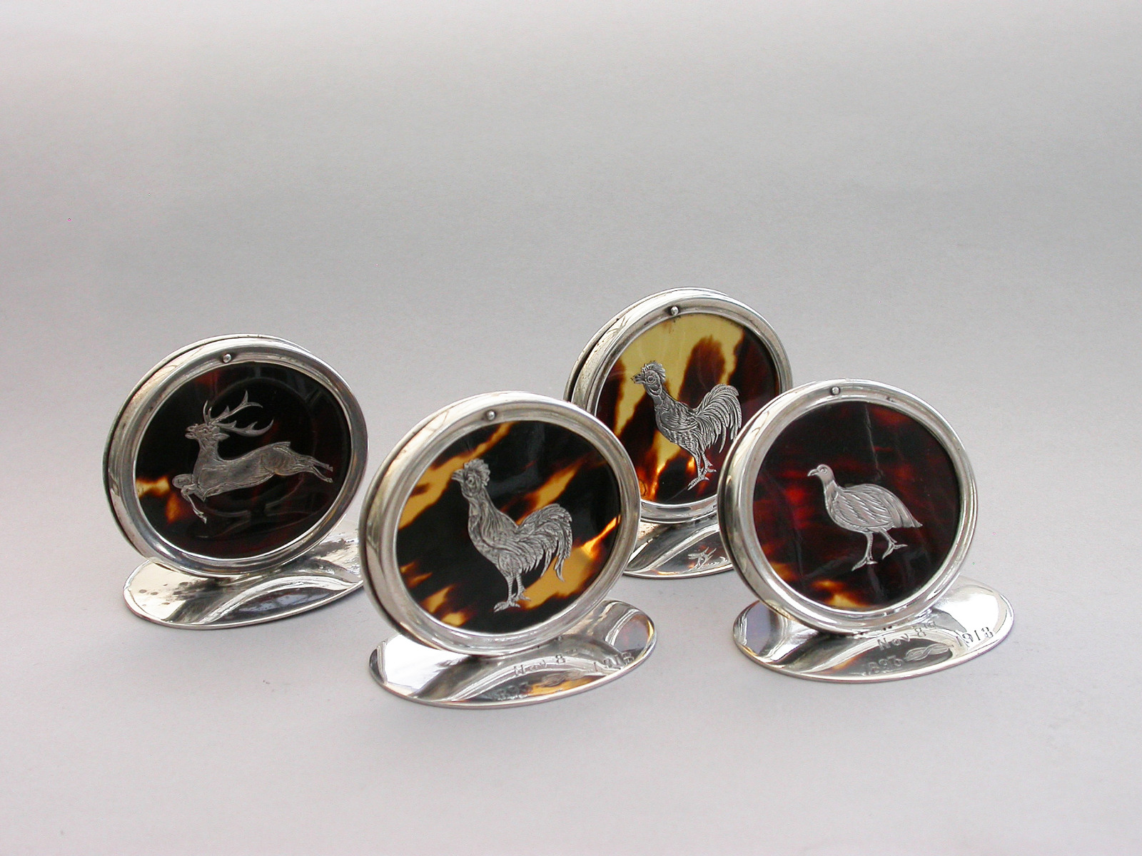 Set of 4 George V Tortoiseshell & Silver Piquet Menu Holders by William Comyns, Birmingham, 1912 (3) - 1913 (1)